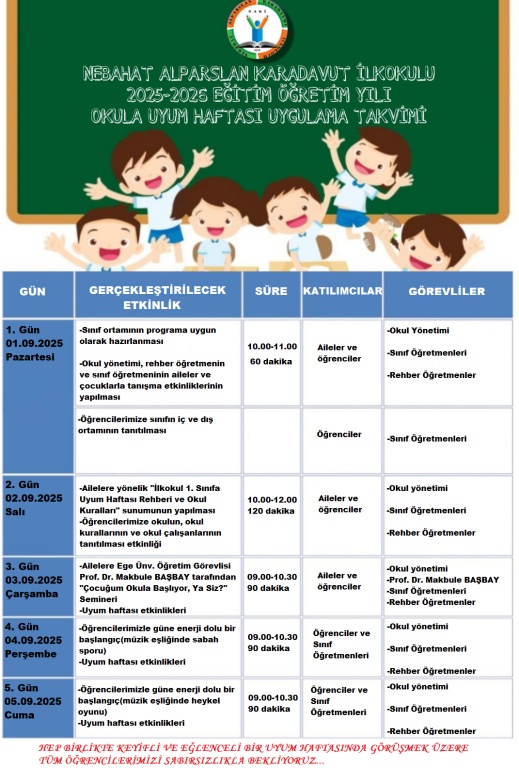 Okula yeni başlayan öğrencilerimiz için ilk ders zili çalıyor. Pazartesi günü saat 10.00'da 1. sınıf öğrencilerimiz öğretmenleri ile birlikte ilk buluşmalarını yaşayacaklar. Okula uyum haftası etkinlikleri için Pazartesi günü saat 10.00'da tüm 1. sınıf öğrencilerimizi okulumuza bekliyoruz.
